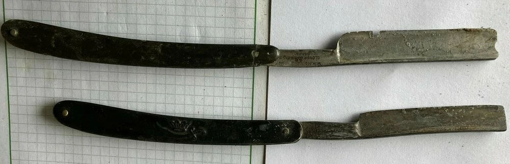 Две трофейные бритвы которые ветеран использовал на фронте, с историей. Принадлежали лейтенанту, командиру минометного взвода, 2го Украинского фронта. Были добыты под Ржевом. Заточка - офицерский ремень. Отличная немецкая сталь.