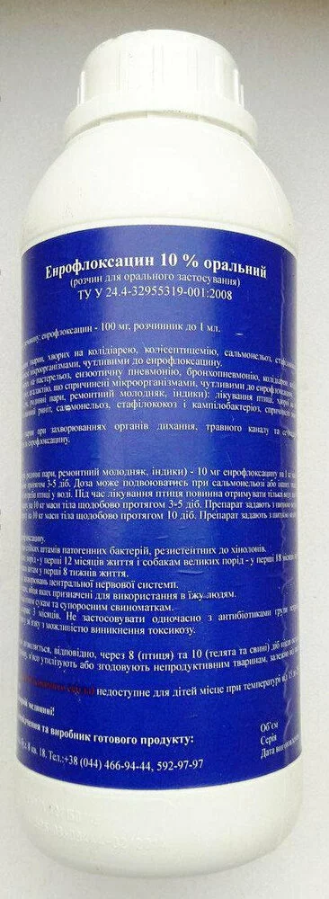 Состав: 100мл препарата содержит действующее вещество энрофлоксацин -10г.