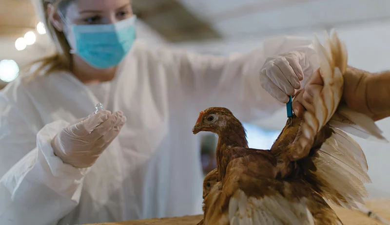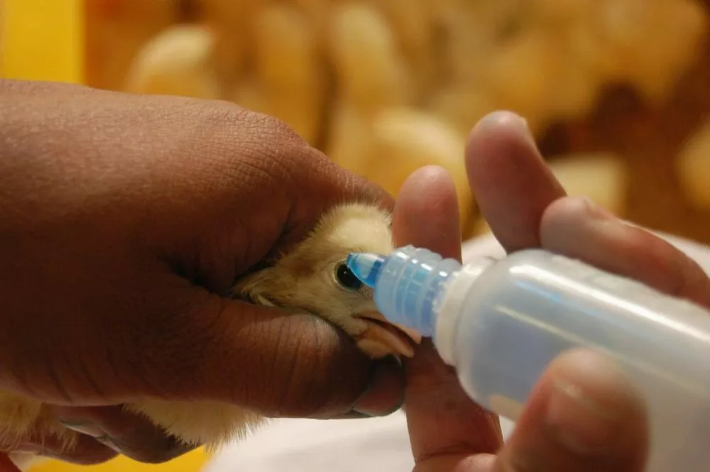 Нанести каплю раствора на конъюнктиву глаза каждой птицы,