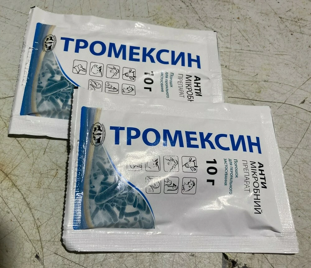Препарат применяют птице и кроликам групповым методом орально в смеси с водой из расчета 2 г на литр воды в первый день и 1 г на литр во 2 и 3 дни. Если симптомы заболевания сохраняются, то через 3 – 4 дня лечение повторяют. Крупному рогатому скоту, свиньям, овцам и козам препарат задается в дозе 1 г тромексина на 10 кг массы тела животного в первый день и 0,66 г тромексина на 10 кг массы тела в последующие 2 – 3 дня. Препарат может задаваться с водой, с молоком или с кормом.