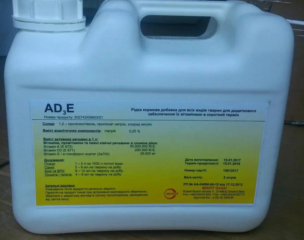 Витамин АД3Е – лекарственный препарат в форме раствора для орального применения на основе комплекса жирорастворимых витаминов для профилактики гиповитаминозов у сельскохозяйственных животных и птицы.