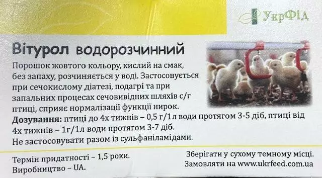 Застосування: в організмі птиці Витурол (Уровіт) знижує активність бар'єрів міжклітинних мембран, внаслідок чого продукти метаболізму при сечокислому діатезі порівняно легко виділяються з організму. Формальдегід, що звільняється в кислому середовищі діє як дезинфікант на слизові оболонки сечовивідних шляхів і сприяє нормалізації функції нирок.